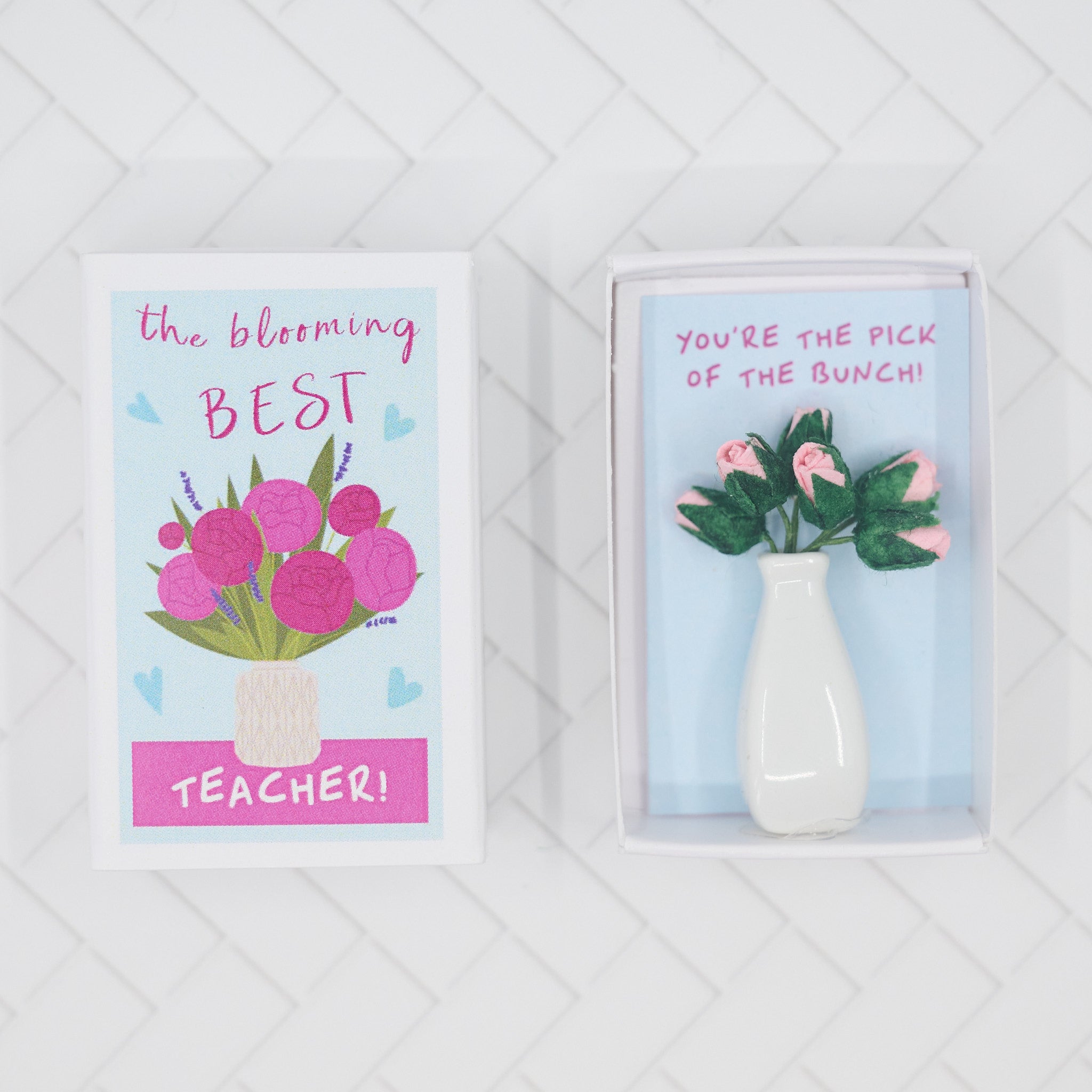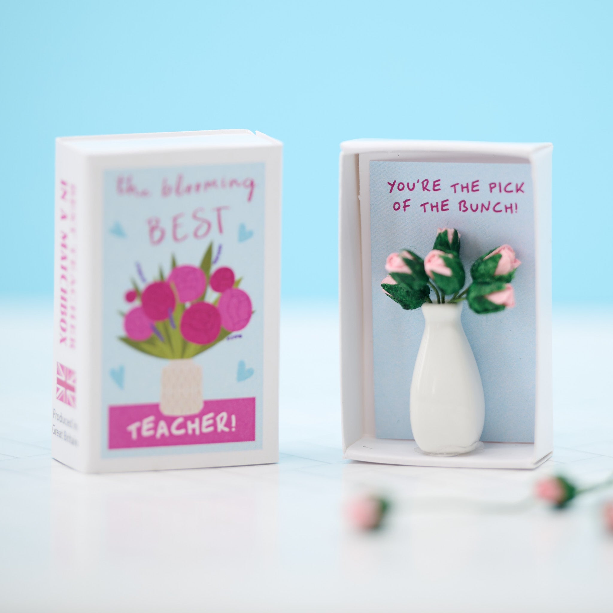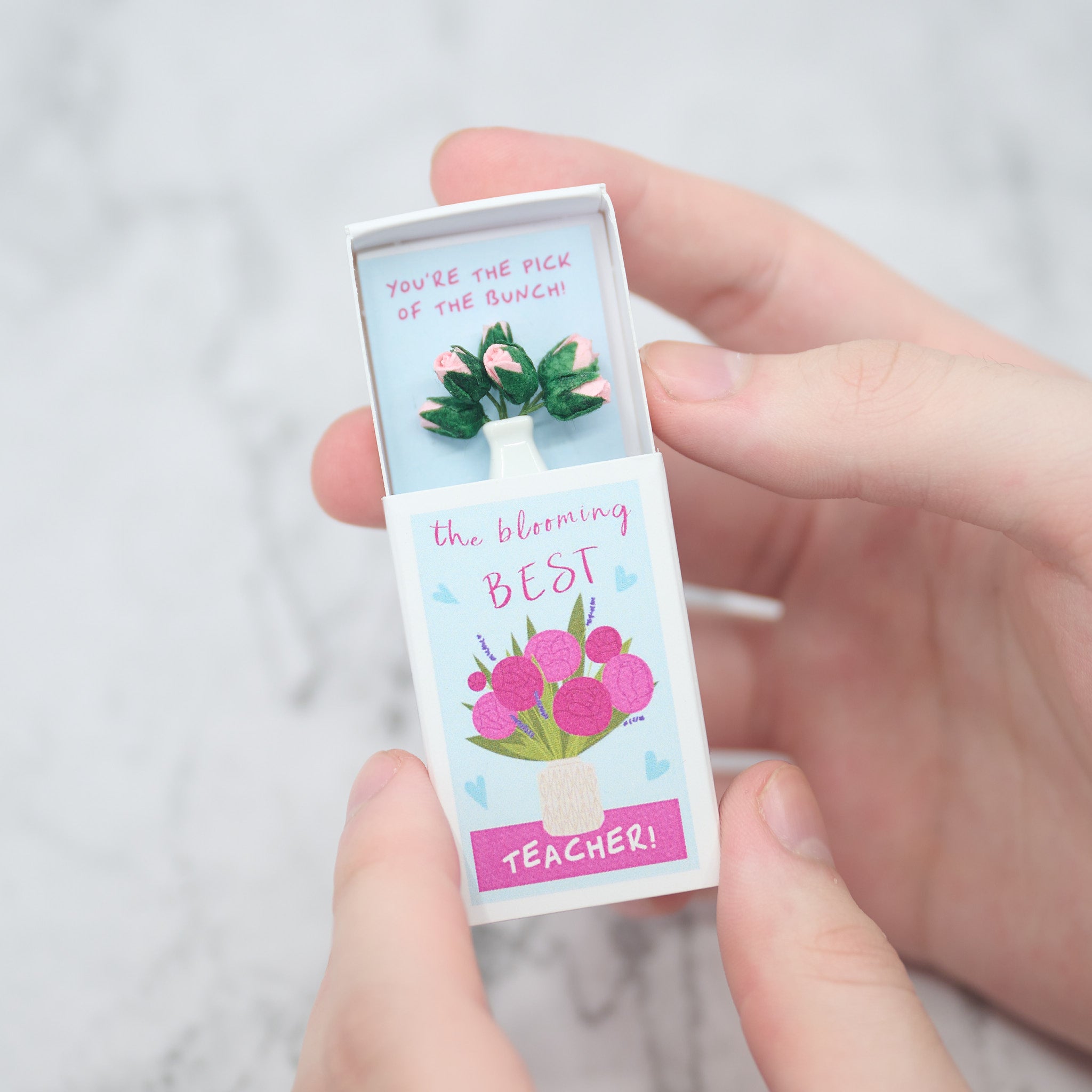 Upon sliding open the matchbox, a heartwarming surprise unfolds: 'You're the pick of the bunch!' greets them, accompanied by a bunch of miniature mulberry paper pink roses, beautifully arranged in a tiny white china vase.