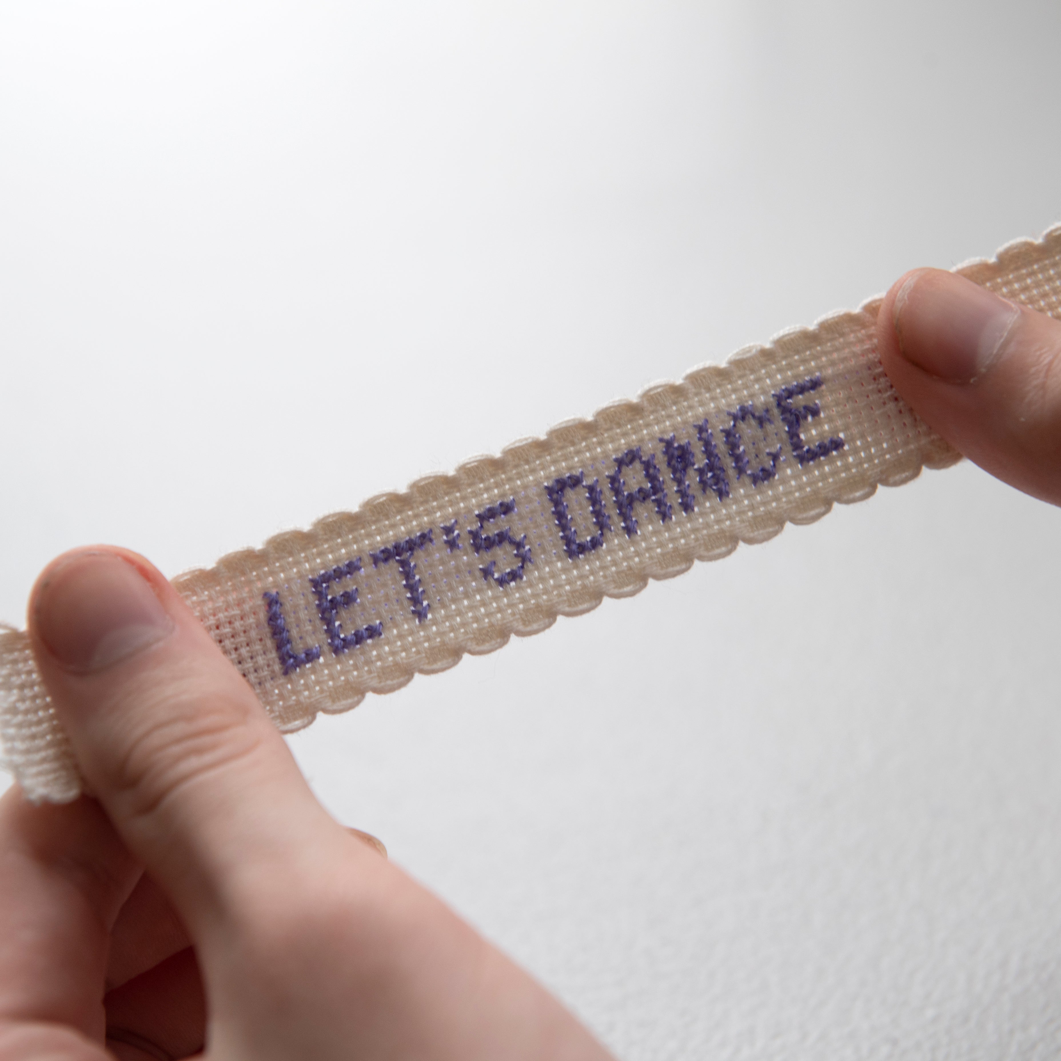 Included in the box is a pattern for the words 'Let's Dance' in an easy number code, 15cm of 2.5cm wide scalloped Aida ribbon, tapstry needle, thread and tips on how to present the finished piece.