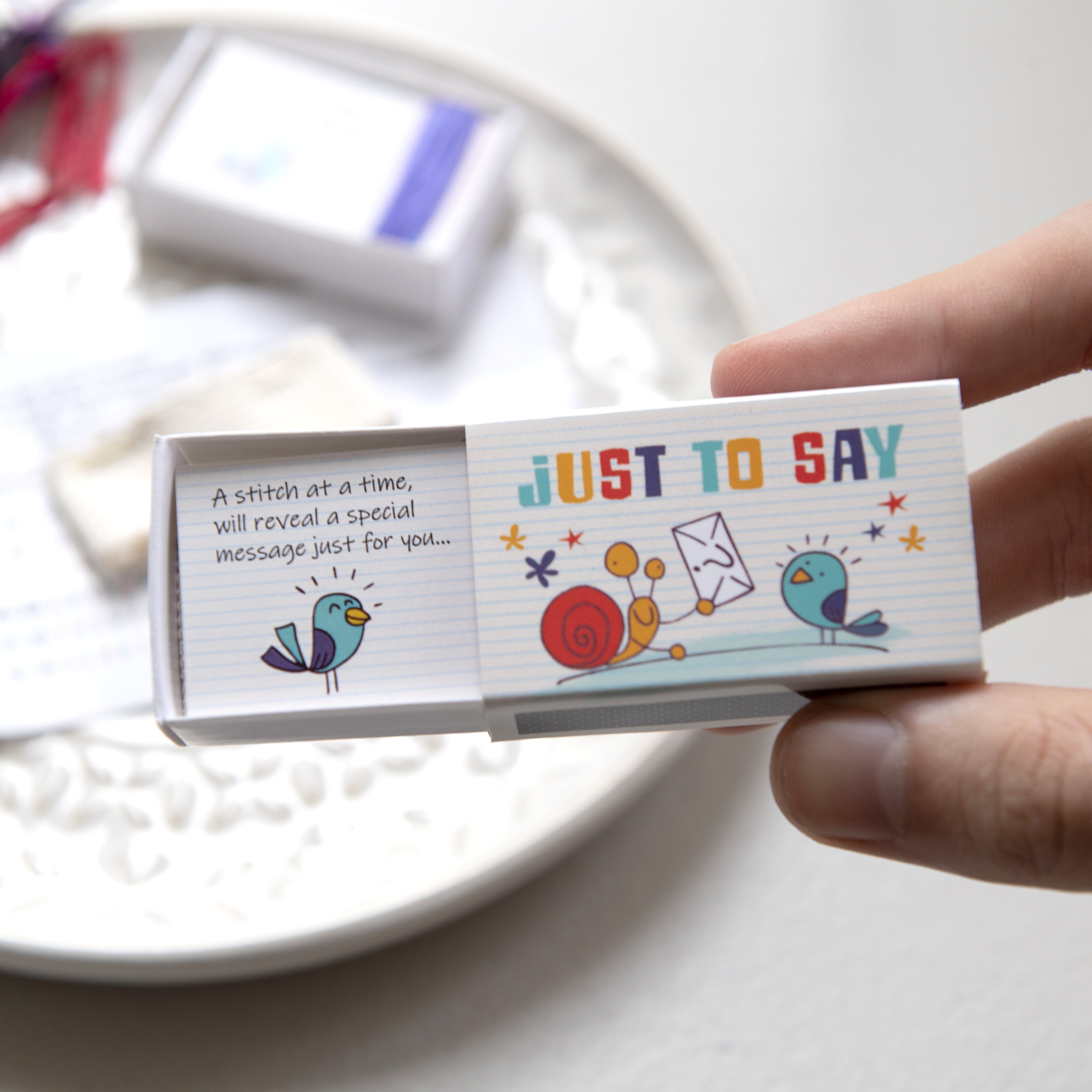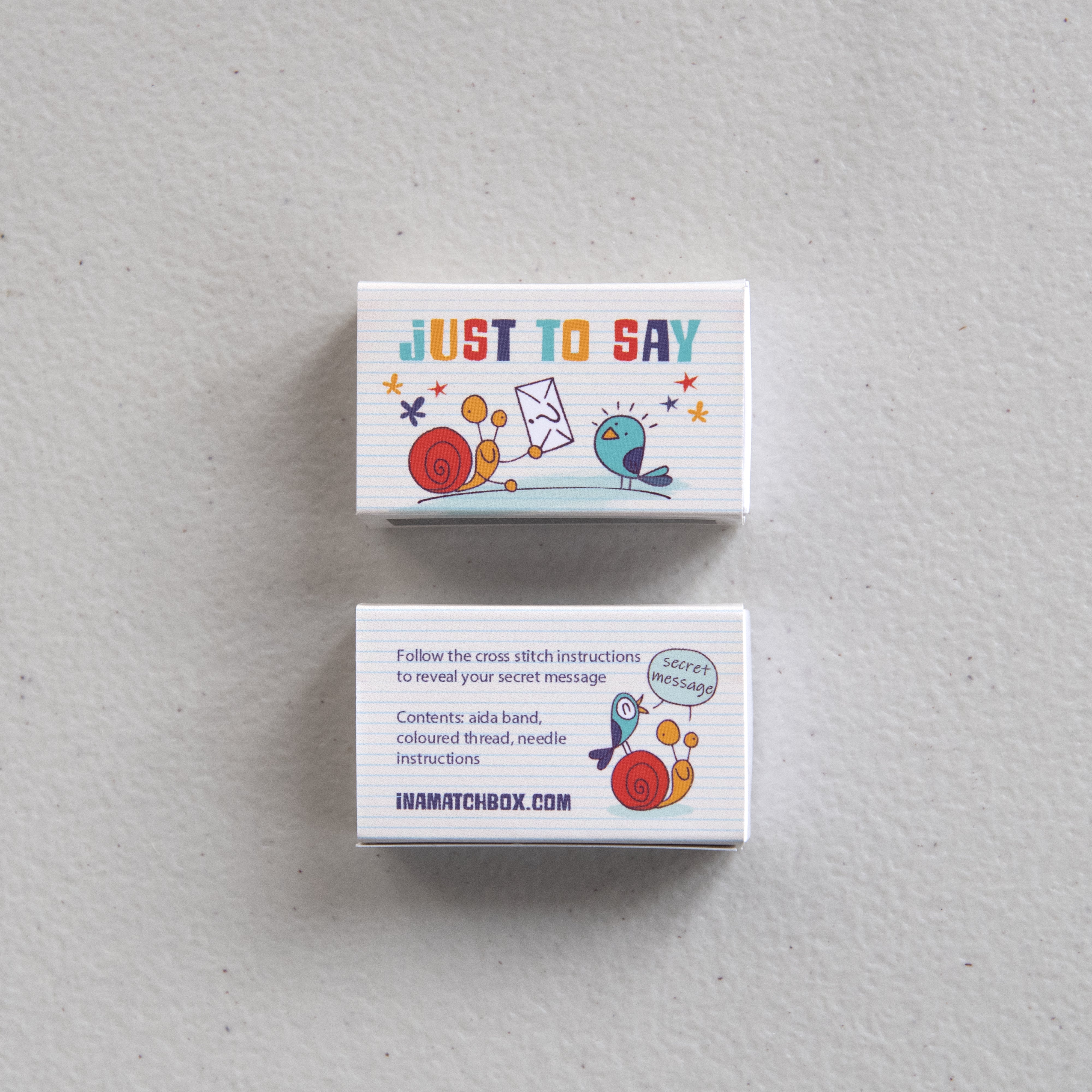 This ingenious little cross stitch kit has everything needed to decode and stitch the secret message 'LET'S DANCE' presented in a matchbox.