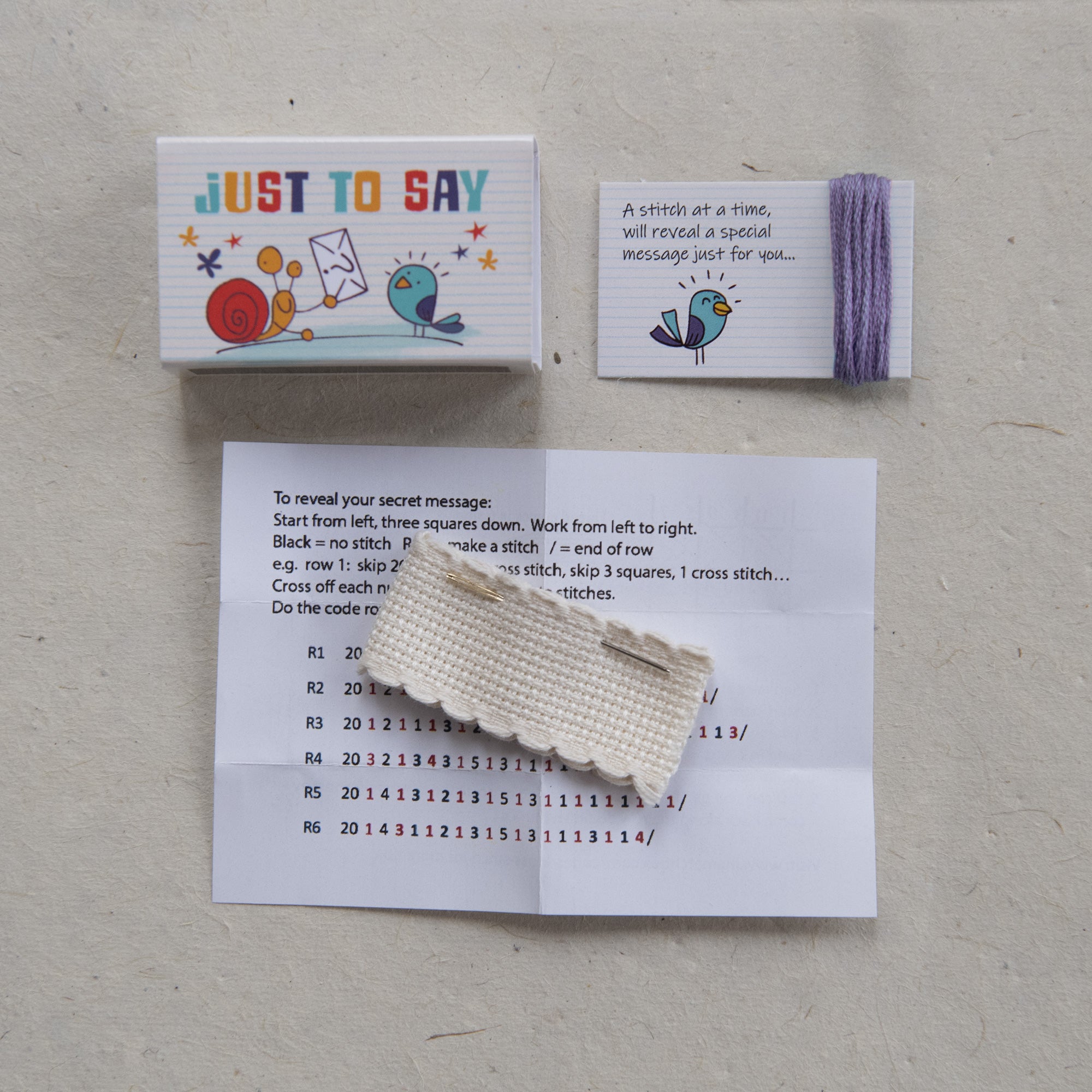Send a fun, uplifting, secret message, with this mini cross stitch coded kit.